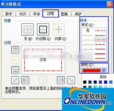 打开“单元格格式”窗口,在“边框”选项卡中我们可以对边框的线条样式,边框的颜色等进行选择修改,如下图所示。