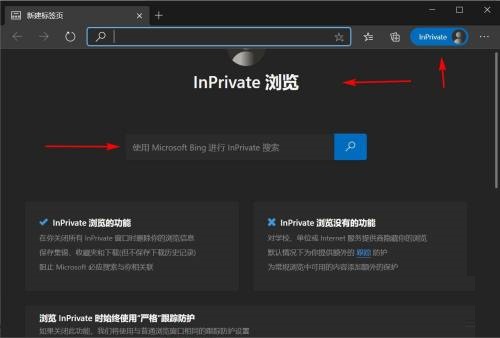 第五步:在新建的Inprivate窗口中,可以看到Inprivate提示;值得一提Windows bing也将采用Inprivate模式搜索(如图所示)。