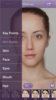 无论是自然的修饰,还是夸张的妆容,都能帮您打造出令人惊艳的效果。 无论您选择潮流妆容一键美妆,还是喜欢DIY打造个性妆容,总有一款适合您。Perfect365是一款基于云服务的照片美化工具,它可以自动识别出人像照片,并且对其加以修饰处理。比如去除皮肤上的暗点,去除黑眼圈。甚至还可以为照片加上化妆效果,为人们提供一个尝试新造型的机会。一键轻松上妆,自然到位!就是这样一款独一无二的人像编辑应用软件。